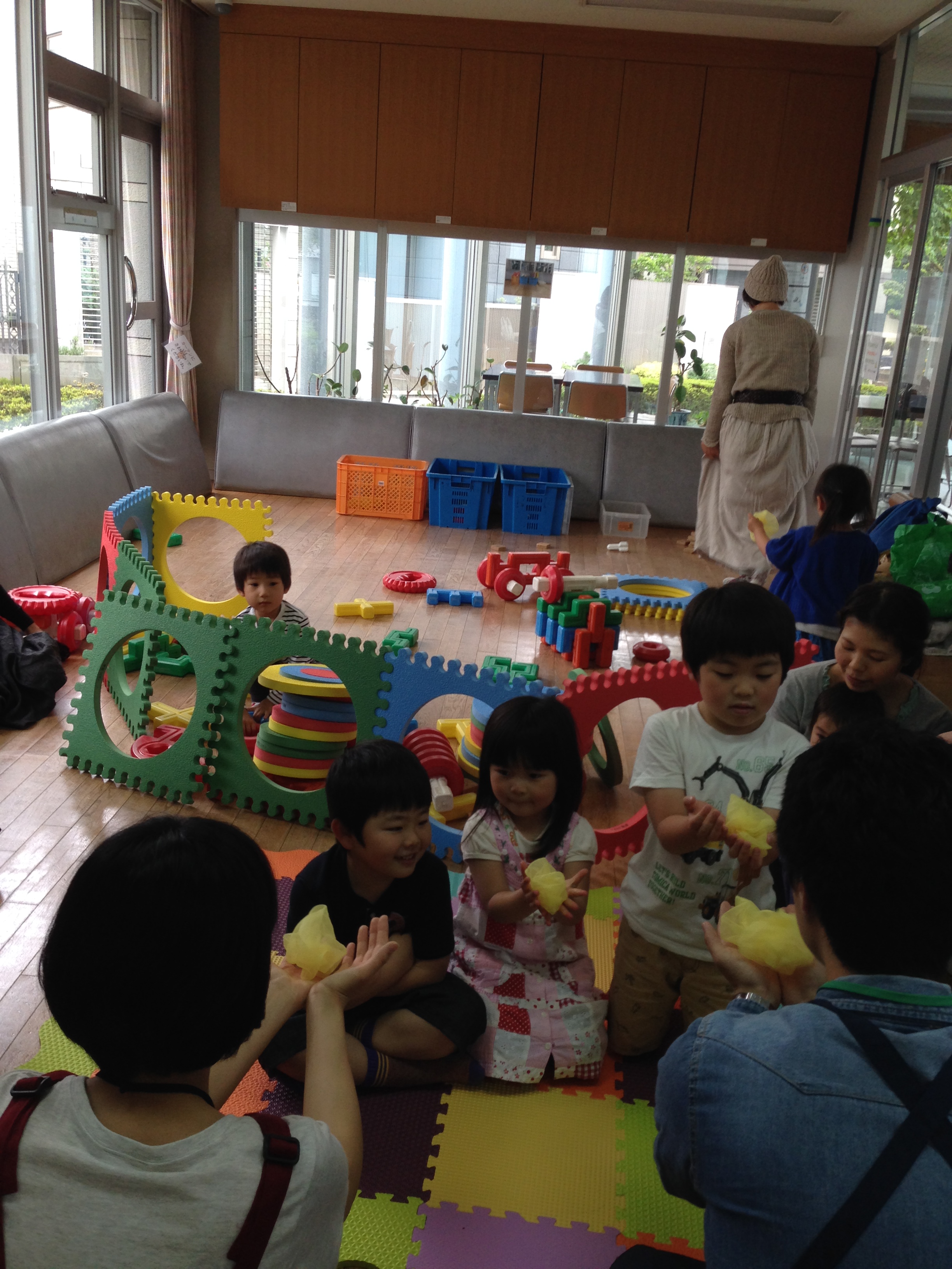 おもちゃで遊んでいた子は最初は何が始まるのかなといった様子で、少し様子見をしていましたがひよこの手遊びが始まると興味津々で周りに集まってきました。