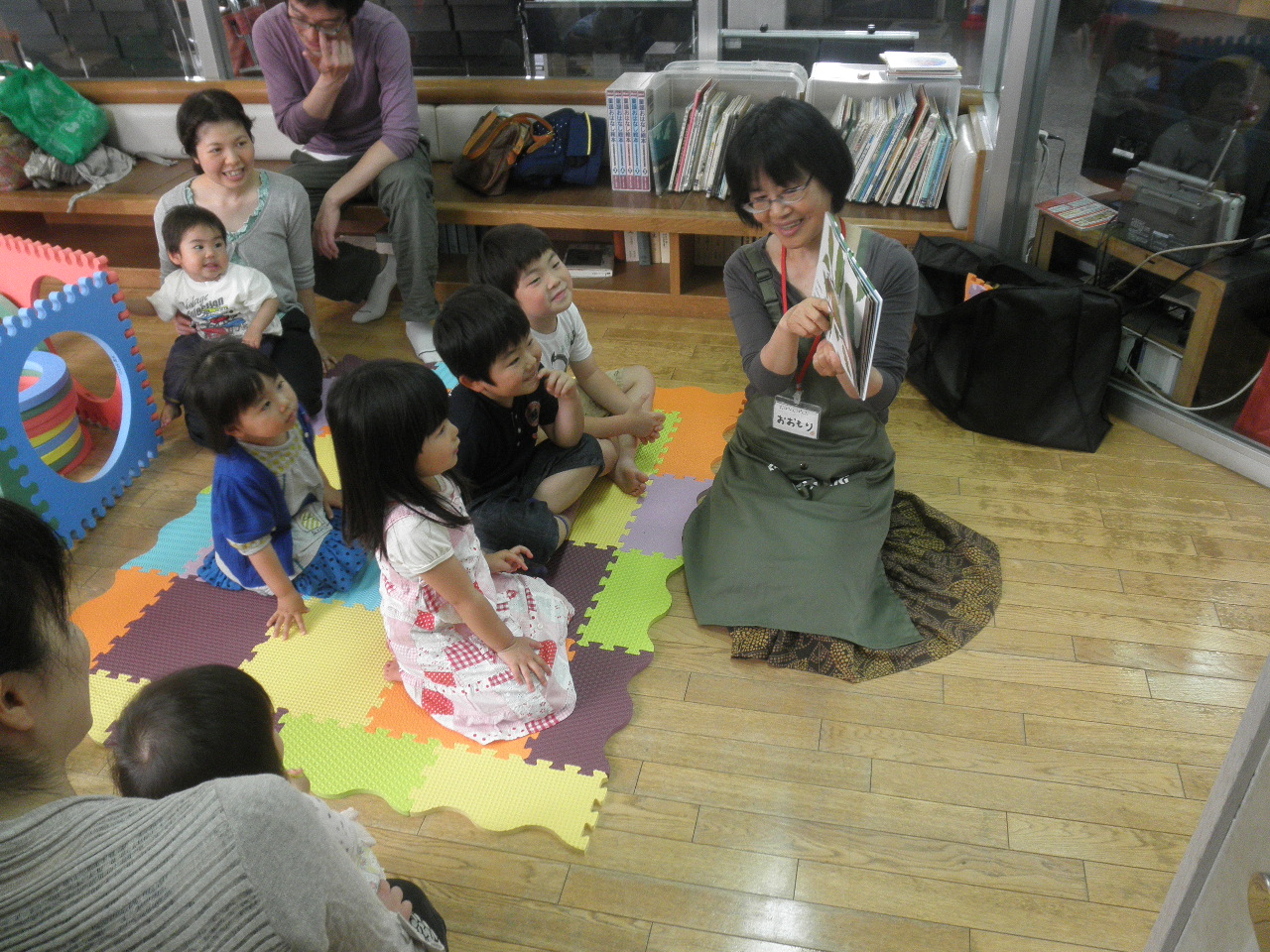 先月から場所が2階の和室から1階の子ども室に変更となっています。今日は子ども室で遊んでいたお子さんたちが多くおはなし会に参加してくれました。
