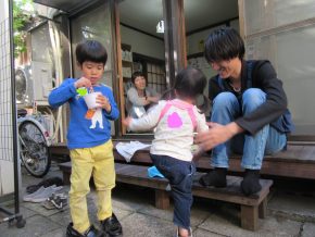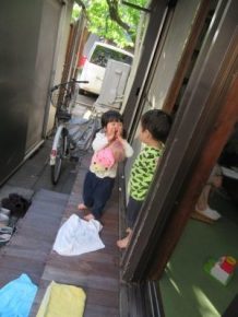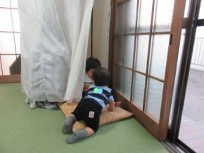 保育園に通いはじめて、ママが帰ってしまうのではないかと思うのか?泣きじゃくるHくんを見守るSくん😿と、覗きに来てくれた大学生ボランティアのKちゃん。みんなにこにこ☺