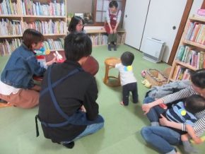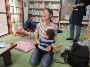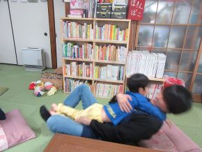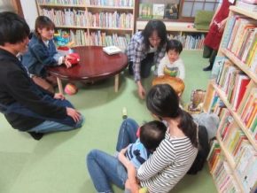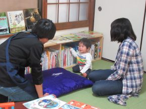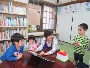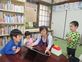 「これ読んで♪」に応えて絵本を読んでいると、おはなしが気になりみんな集まってきて・・ちゃぶ台の周りで小さなおはなし会が始まりました📖