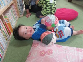 お母さんの抱っこ紐に揺られて、お昼寝していたKくんも目が覚めました~👀 布のボールをパフパフ〇