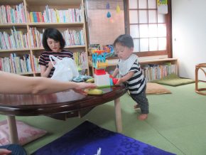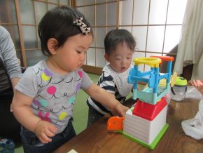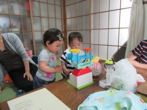 最初はおかあさんにくっついていたMちゃん、Tくんとおもちゃでがたごと