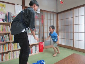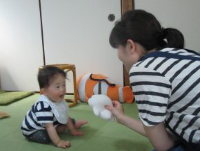 Tくんも「さよなら」 Mちゃんは頭にお手玉でどう?
