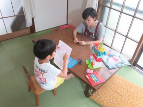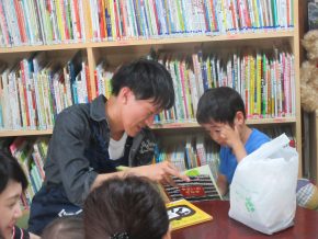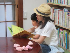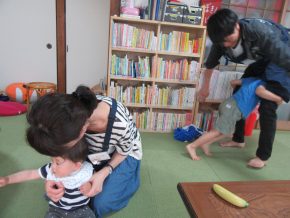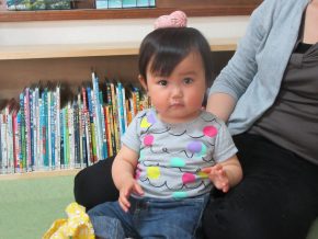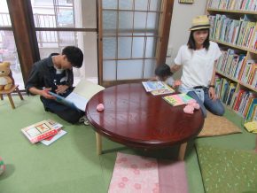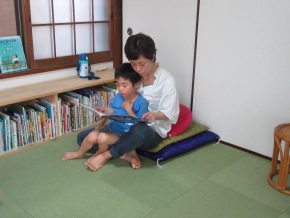 一息ついて、絵本を読むHくん、お母さんの膝に、Rくんとも。