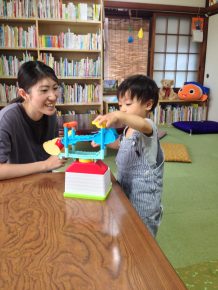 「どんな絵本を見せればいいのか」「すぐ飽きて、聞いてくれない」などの相談を受けながら、当事者Mちゃんはご機嫌に絵本を聞いたり、お手玉で遊んだり。