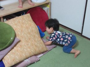 それにFちゃん、Sちゃんが、くっついています。Sちゃんは、座布団トンネルを覗いてみたり~