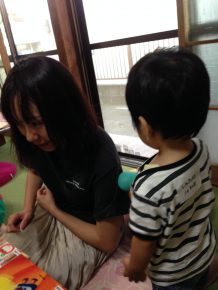 ヤワコを使って、Sちゃんがおかあさんの肩をごろごろごろごろ、親孝行?!ついでに自分もごろごろ