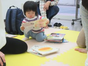わらべうた、手遊びの間も本を離さないAちゃん