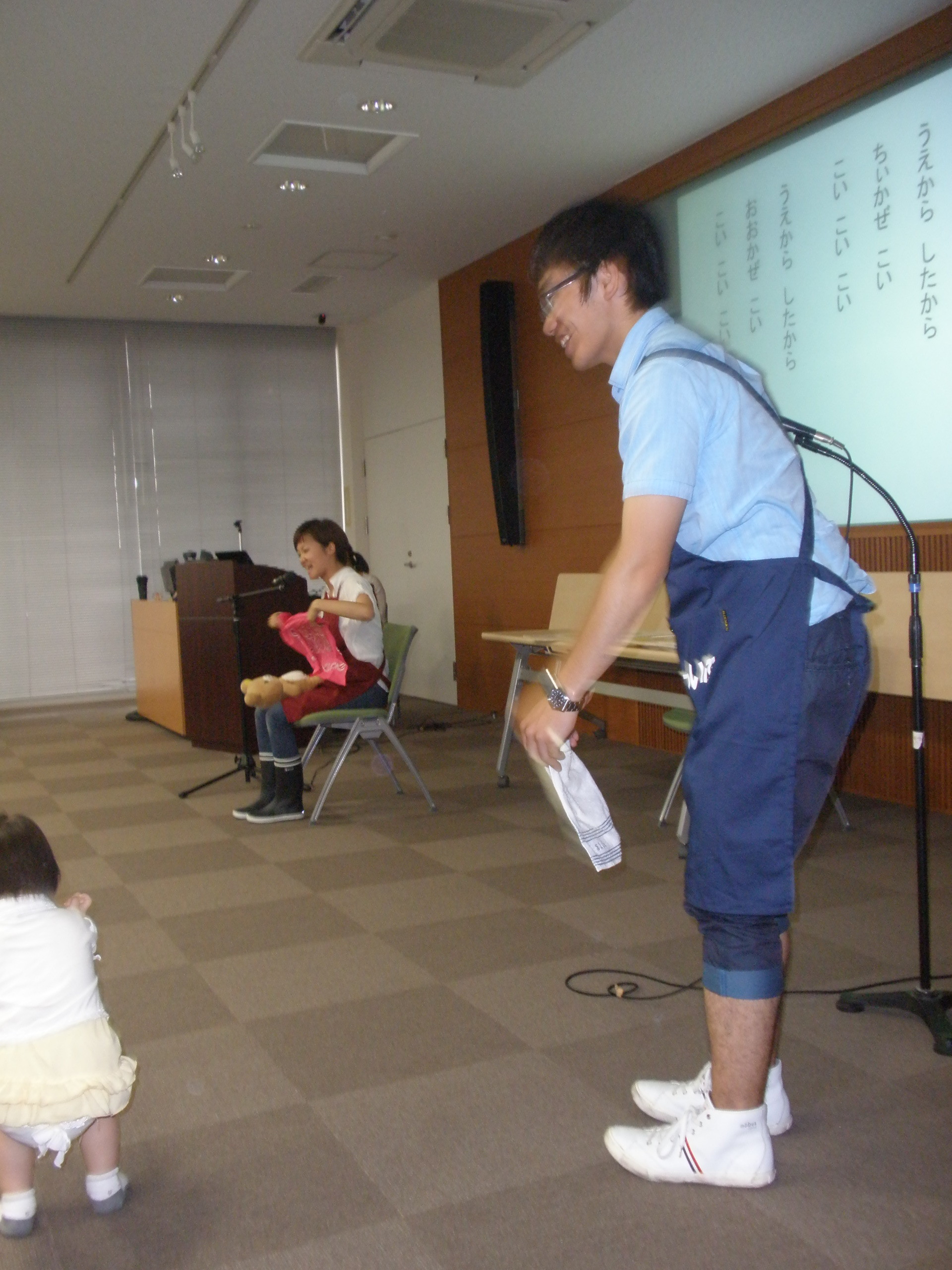 わらべうたは「うえから したから」♪ ハンカチやタオルをつかって、風を送ります。風にあたりながらきゃっきゃと一緒に手をばたばたさせたり、小さな子も少し大きな子も楽しんでくれました。