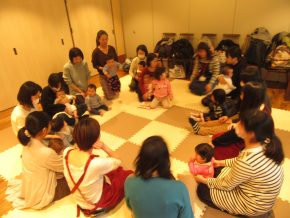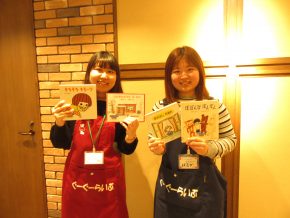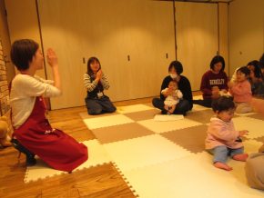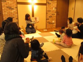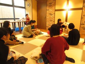 四冊目が終わったところで、再びわらべうたの時間。「よいしょぶね」はお母さんのお膝の上にまたがってトントン跳ねる遊びで、会場全体にきゃっきゃっというお子さんの可愛い笑い声が響きわたりました。しかし一方でお母さんからは、「膝に効く・・」との嘆きの声が。。わらべうたでお子さんと遊びながらエクササイズが出来るとは、まさに一石二鳥!!