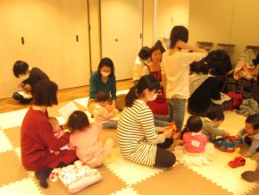 お話会が終わると、本の貸出が行われたり、オモチャで遊んだり、お母さん同士で会話を楽しんだりと、思い思いに楽しい時間を過ごす皆さんで大賑わい。5か月の男の子がみんなの視線を浴びながら寝返りをした時には、会場から拍手が!お子さんの成長に立ち会えたような感動を皆で分け合いました。