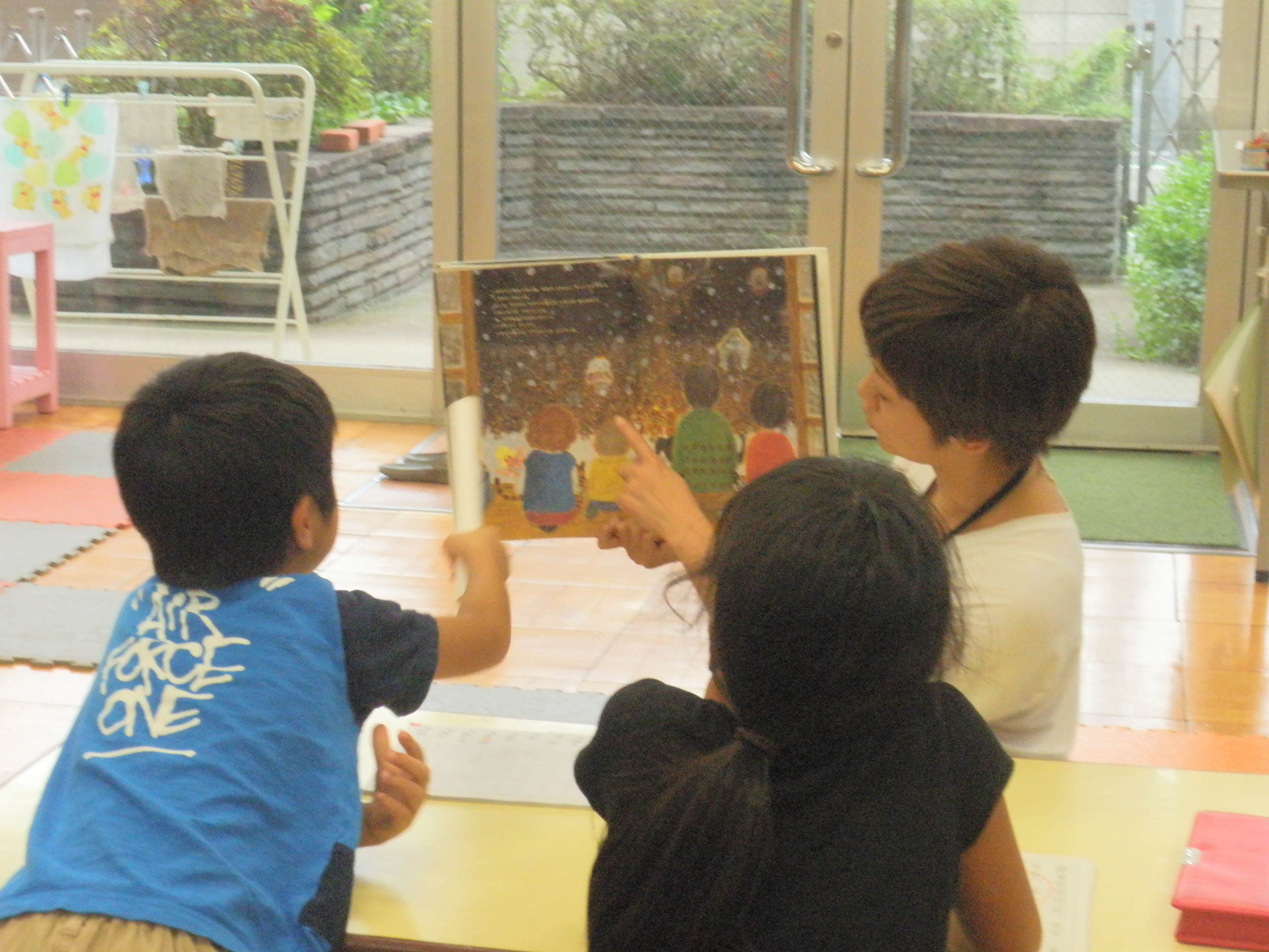 そして最後の絵本は「ほしにむすばれて」。谷川俊太郎さんのしっとりとした絵本ですが、「これ持ってるよ!」「この絵本好き!」なんてまたあちこちから声が聞こえて、最後まであれこれ参加してくれながら、しっかりと絵本の世界を楽しんでくれました。