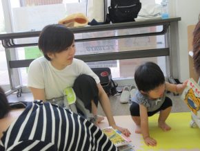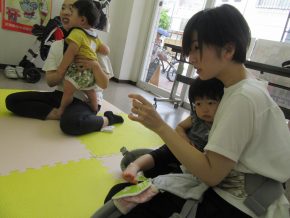 その声に驚いたのか、常連のAちゃんがお母さんにすがって泣き出し、次にきたTくんもちょっとべそをかき・・しばらく泣き声の大合唱。 それでもおはなし会が始まる時間には1歳未満組はにこにこ、2歳のAちゃんは泣くのはやめてもお母さんにべったり。年齢により反応はさまざま