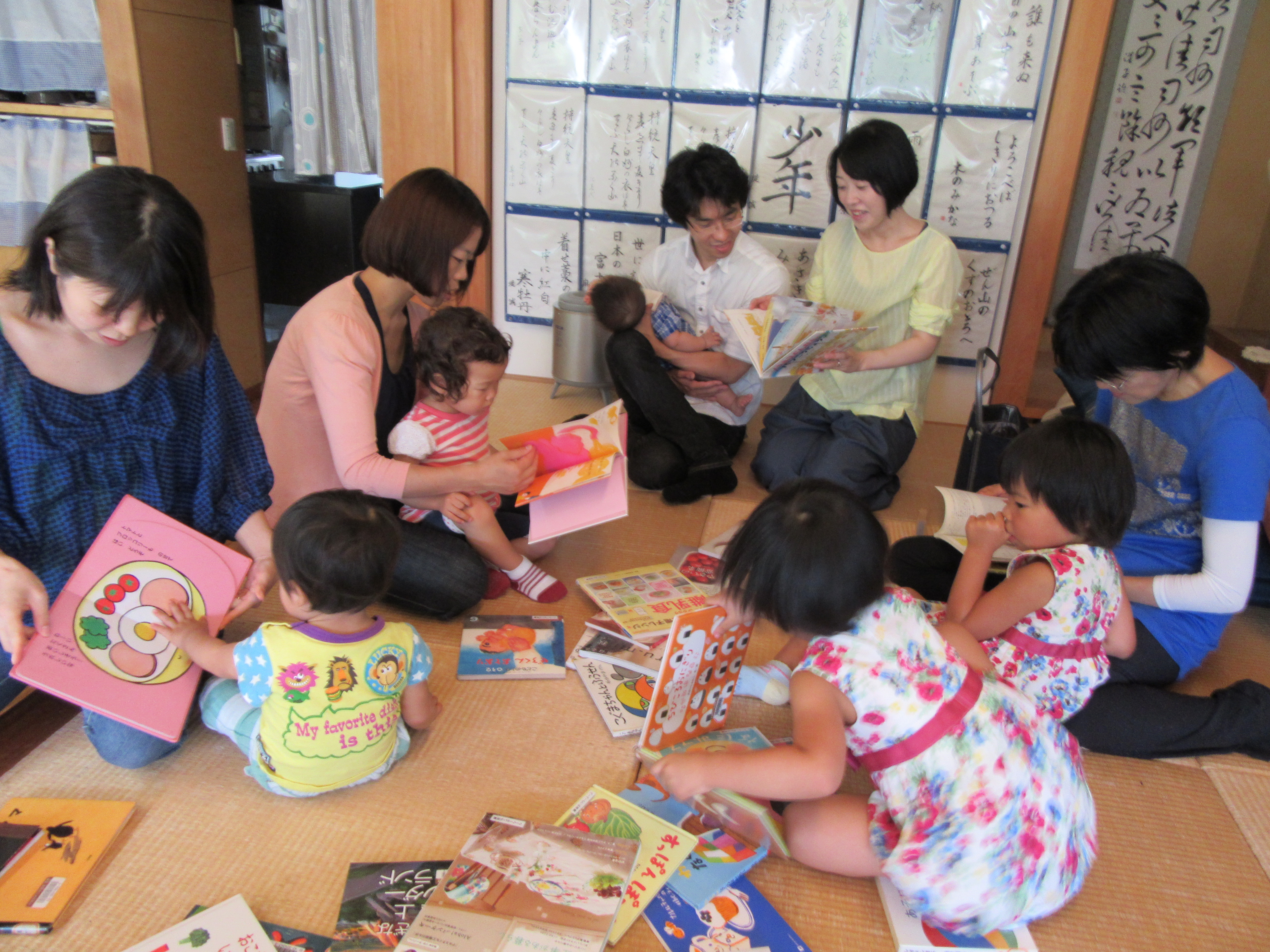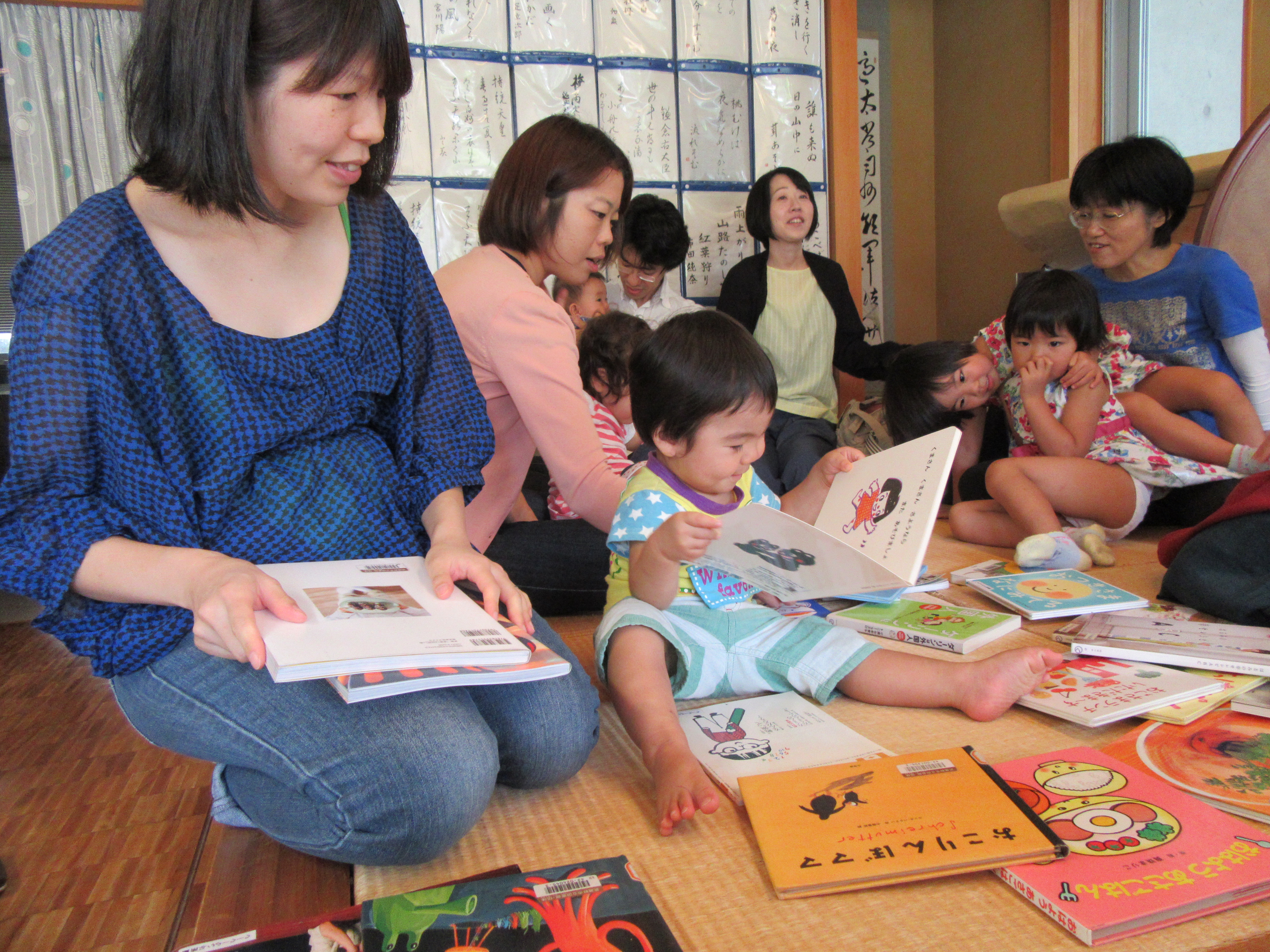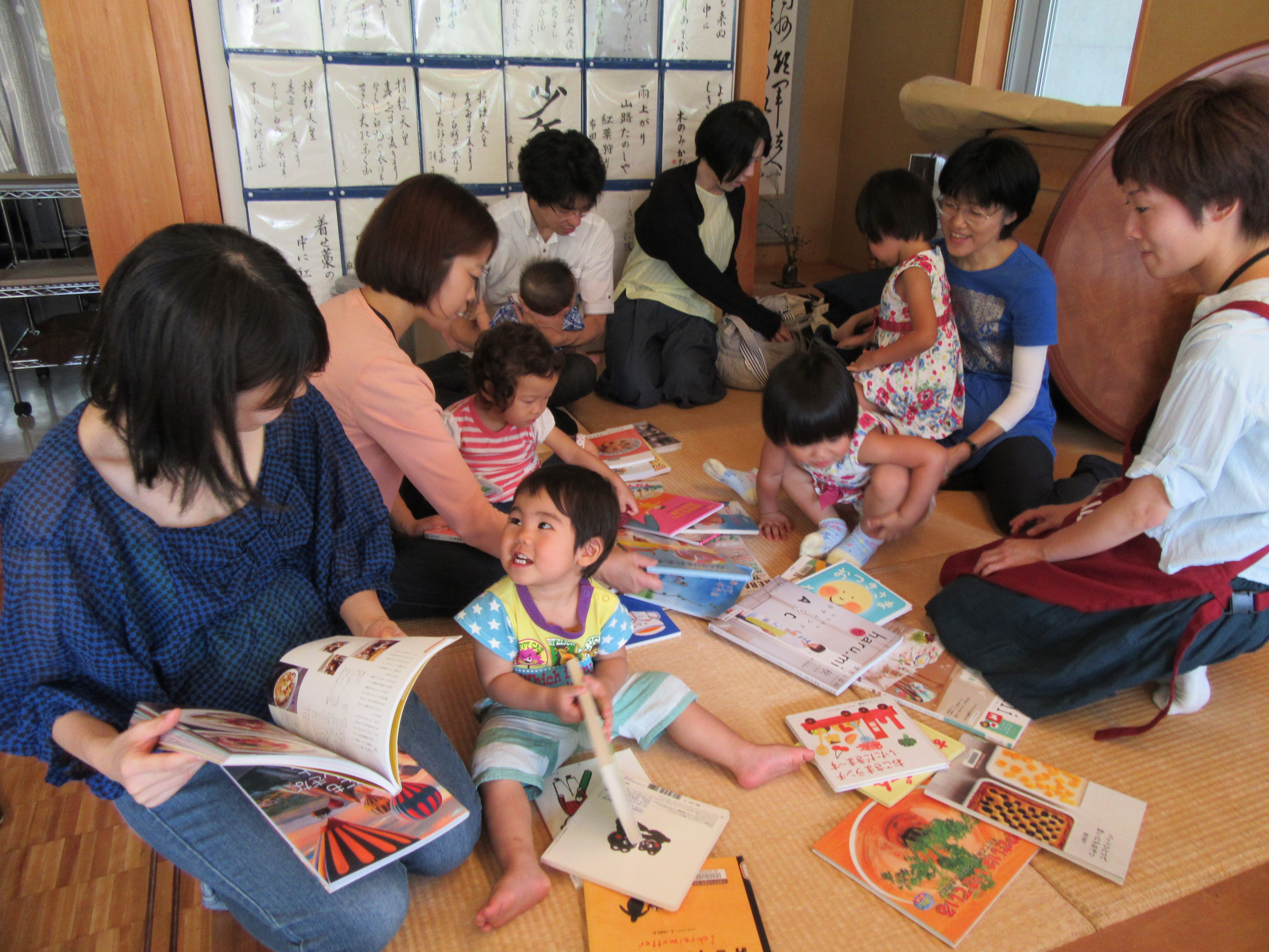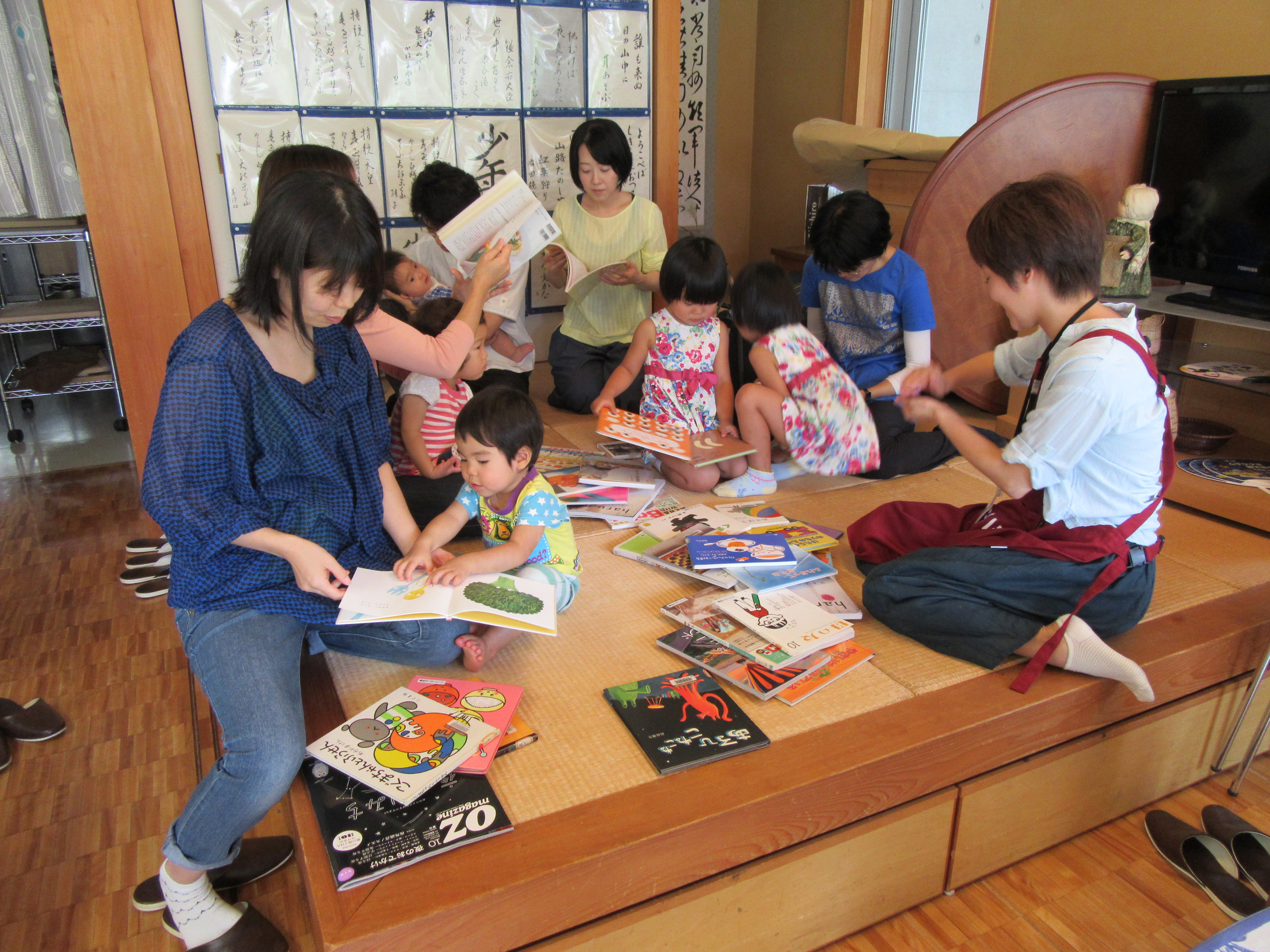 畳のスペースに持参した本たちを出したら、子どもも大人もみんな手にとって「どれにしようかな~?」