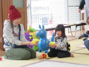 幼児連れもお母さんたちはコミセン備え付けのおもちゃであそんだり、お昼を食べたり。