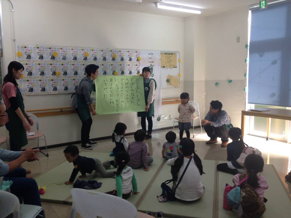 「さんまいのおふだ」少し長いおはなしでしたが、怖がってお母さんにしがみつく子が出てきたほど、みんな絵本の世界に入っていました。