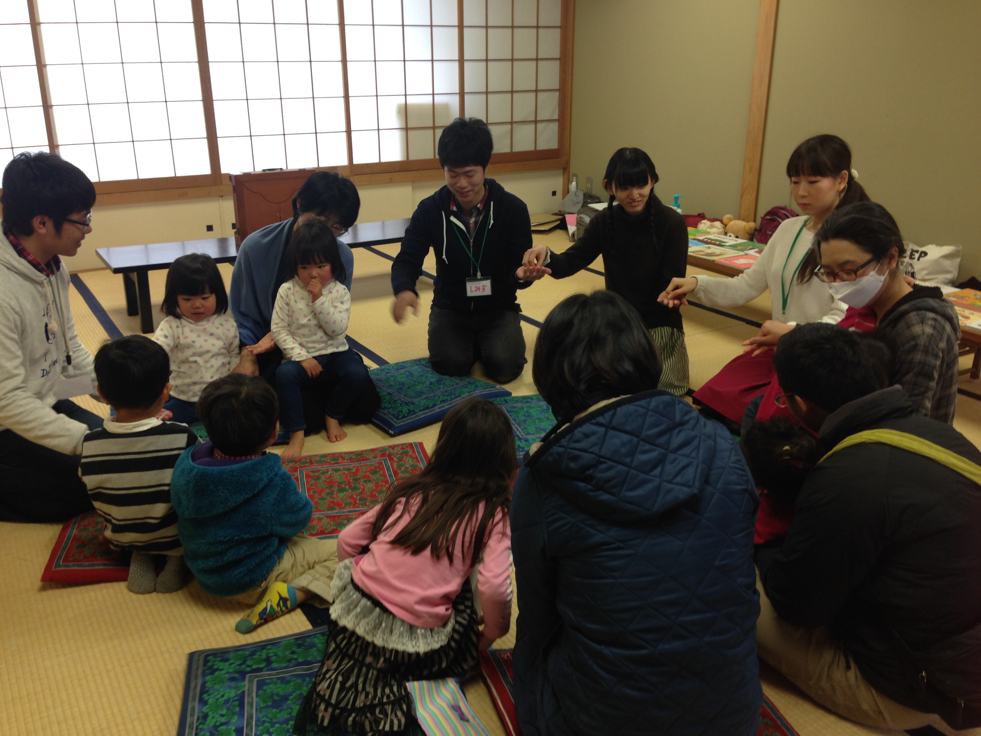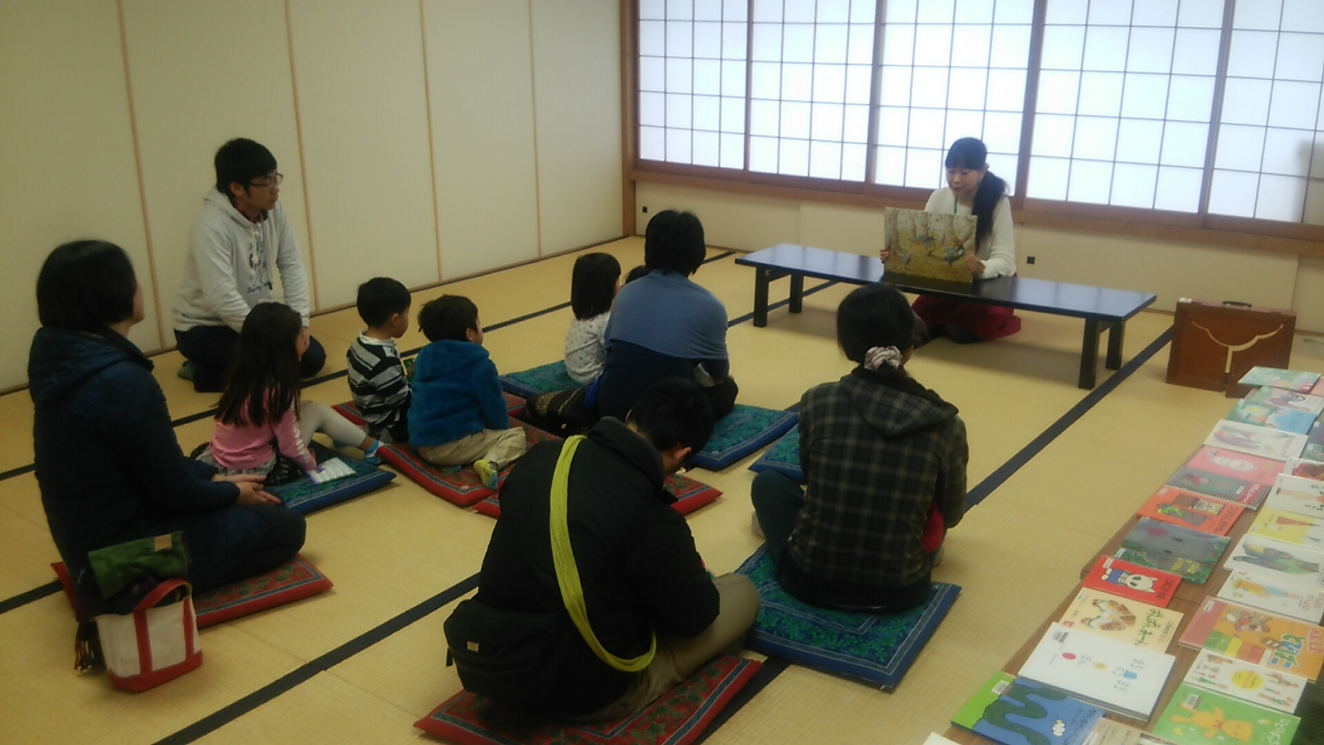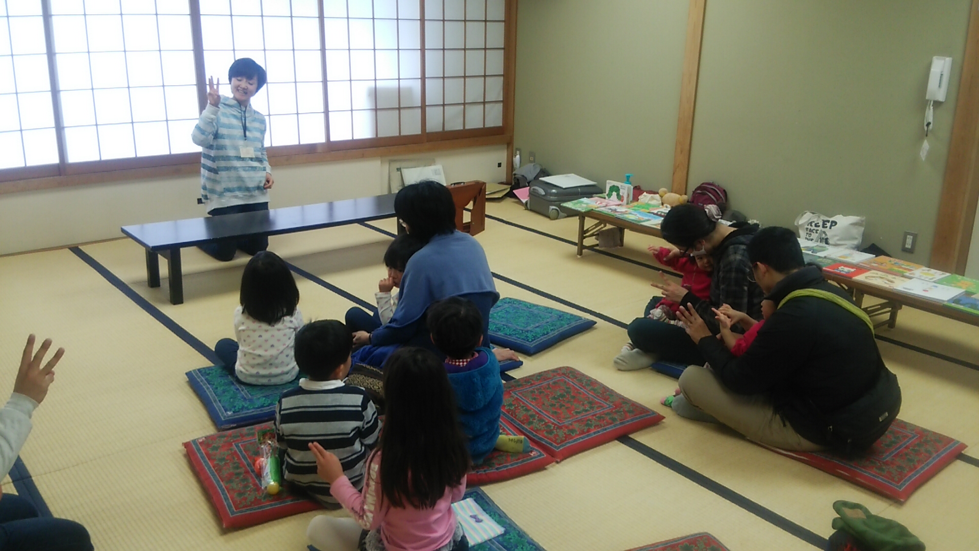 今日は本宿コミセンで紙芝居おはなし会を行い、たくさんの子どもたちとお父さん、お母さんに遊びに来ていただきました。